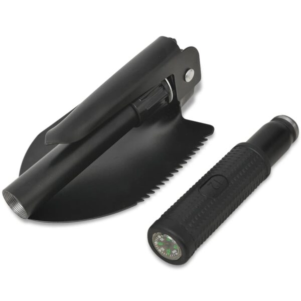 Praktična sklopiva lopata, može se koristiti kao lopata, sjekira, pila i otvarač boca / limenki. Također ima kompas na kraju ručke. Od visokokvalitetnog ugljičnog čelika, lopata je čvrsta ali lagana. Sklopiva je i može se pohraniti u prikladnu, uključenu torbicu.
